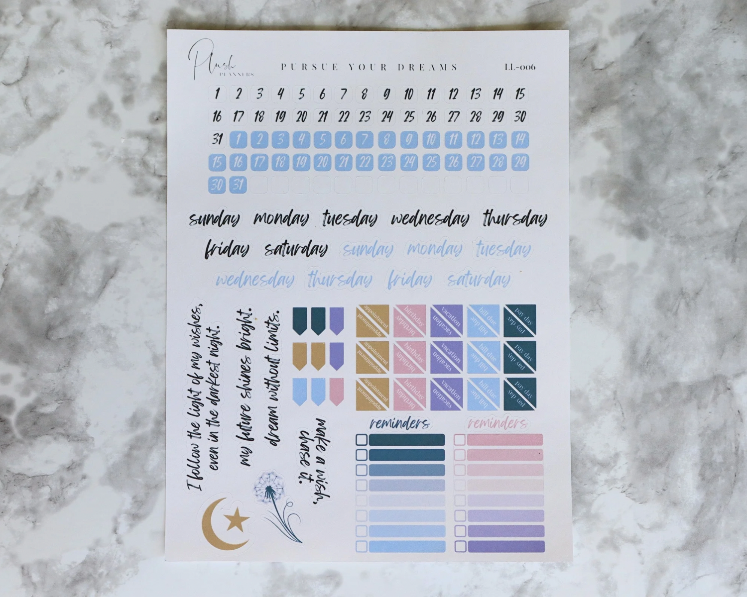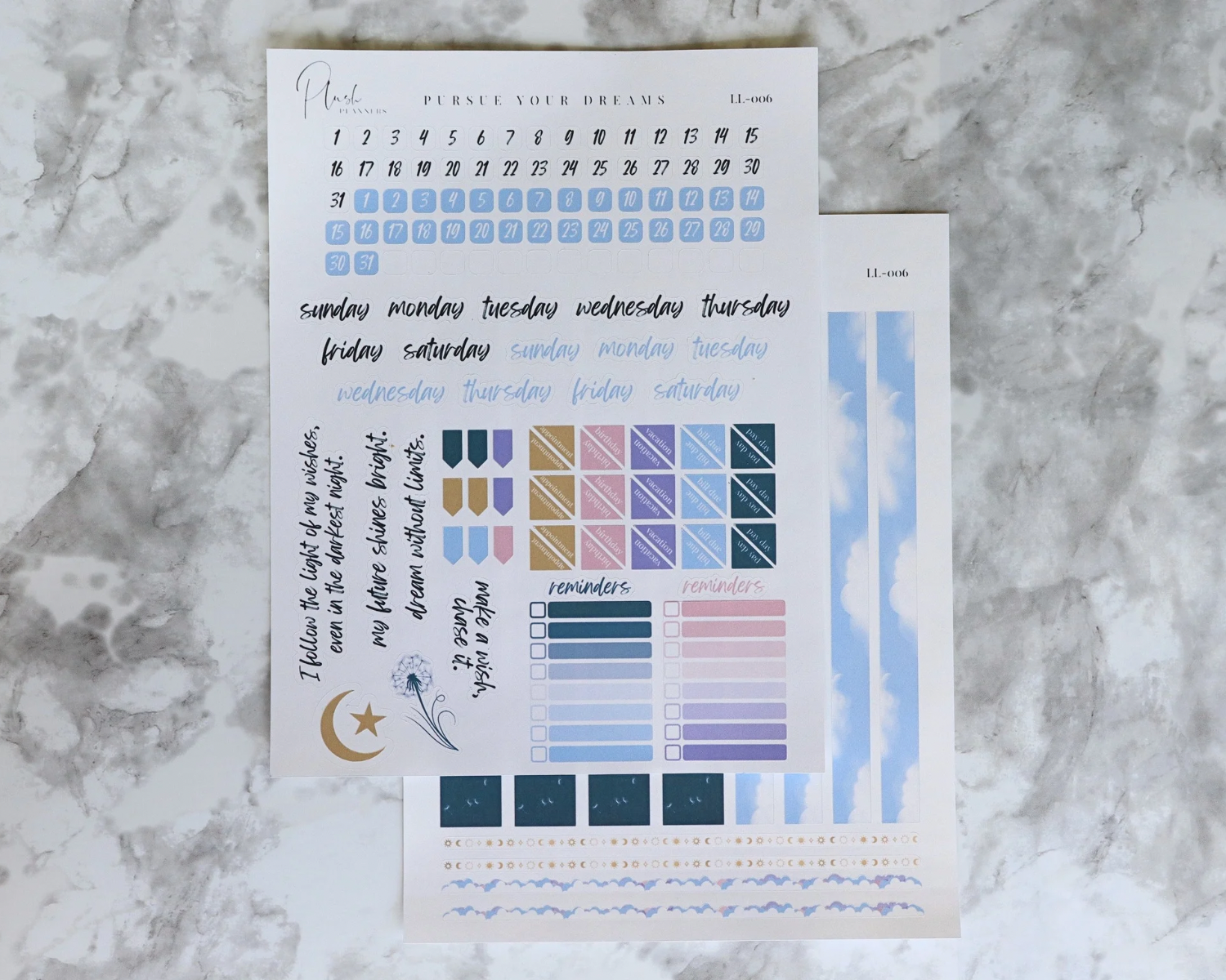 Each collection is thoughtfully designed to cover two full monthly spreads, making them a cost-effective way to create a cohesive, polished look in your planner. From borders/washi tape accents to days of the week, numbers, productivity tabs, and gentle affirmations, these stickers are built to guide your goals and encourage positivity every step of the way.